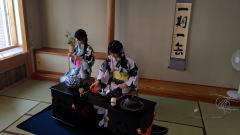 お茶をたてる体験してもらっています。日本文化を堪能していただければ幸いです。