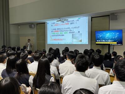世界で活躍する人の体験に基づく話を聞き、海外で生活をすることや外国語を用いて仕事をすることを具体的にとらえ、将来設計や進路選択の一助とするための講演会です。今年度は外務省の職員をお招きし、国際社会で必要なスキルや現地(インドネシア)での貴重な体験談をお聞きしました。