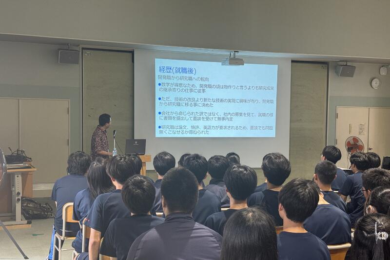 理数工学科の1~3年生を対象に、データサイエンス講演会を開催しました。講師は、本校情報技術科の第3期卒業生で、現在は研究職として幅広くご活躍されている栗林壮太郎さん。高校時代の学びが今の研究にどう生きているのか、リアルな経験談を交えながらお話しいただきました。同じ工業科の先輩からの言葉に、生徒たちは大いに刺激を受け、将来を考える大きなヒントを得ることができました。